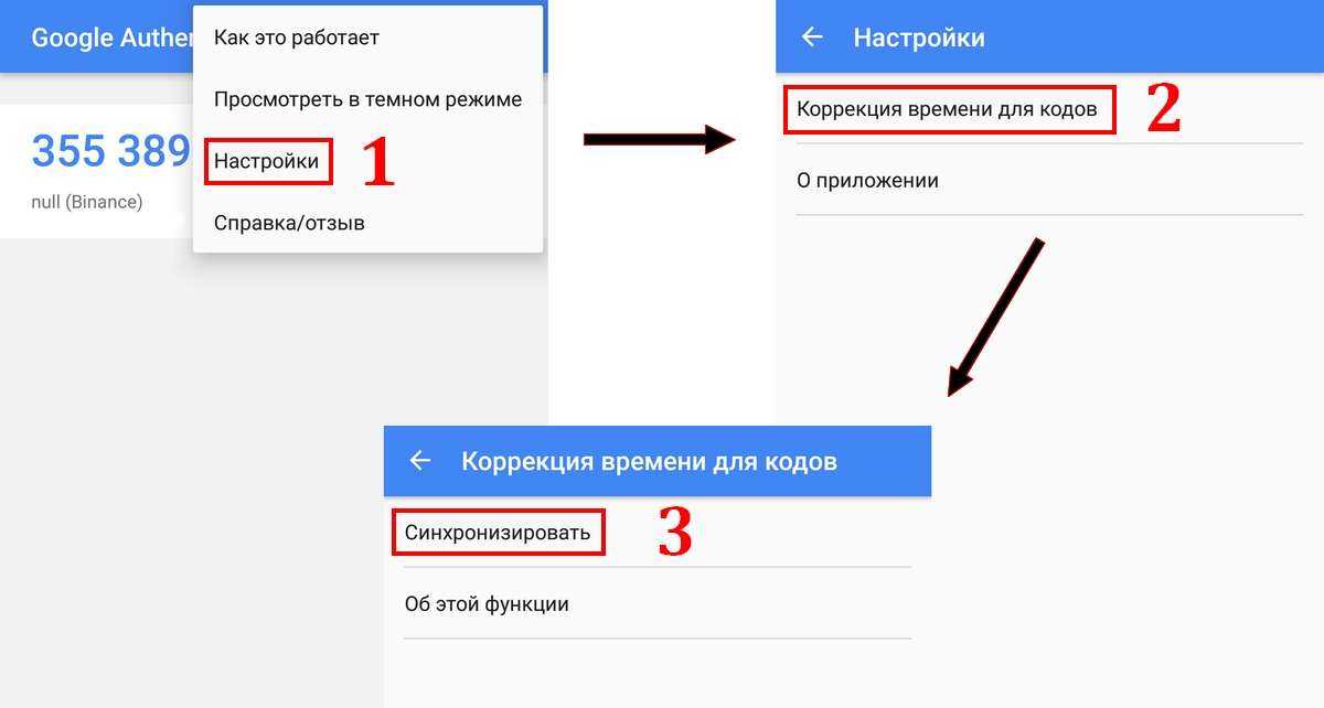 Иногда Вы можете сталкиваться с такой проблемой, когда Ваш код не будет срабатывать — и вроде бы Вы делаете все правильно, но в то же время при очередном входе в аккаунт видите надпись — Неверный код. Такое может случаться из-за того, что сбивается время. Чтобы исправить это, зайдите в приложение Google Authenticator и нажмите на кнопку «…» в правом верхнем углу, для вызова меню, в котором выберите «Настройки» (1), затем «Коррекция времени для кодов» (2), после чего нажмите кнопку «Синхронизировать» (3):
