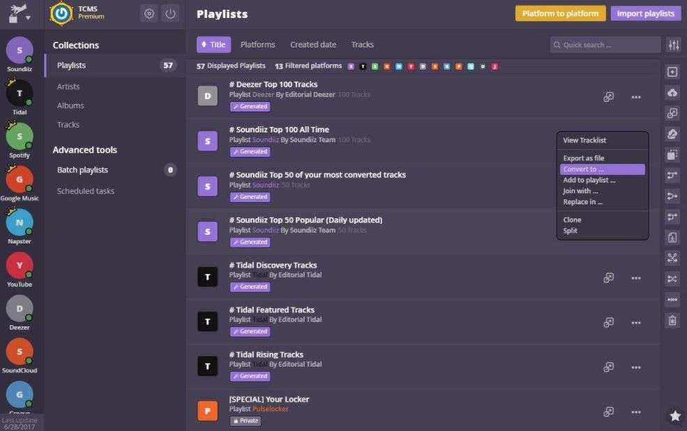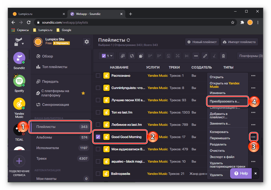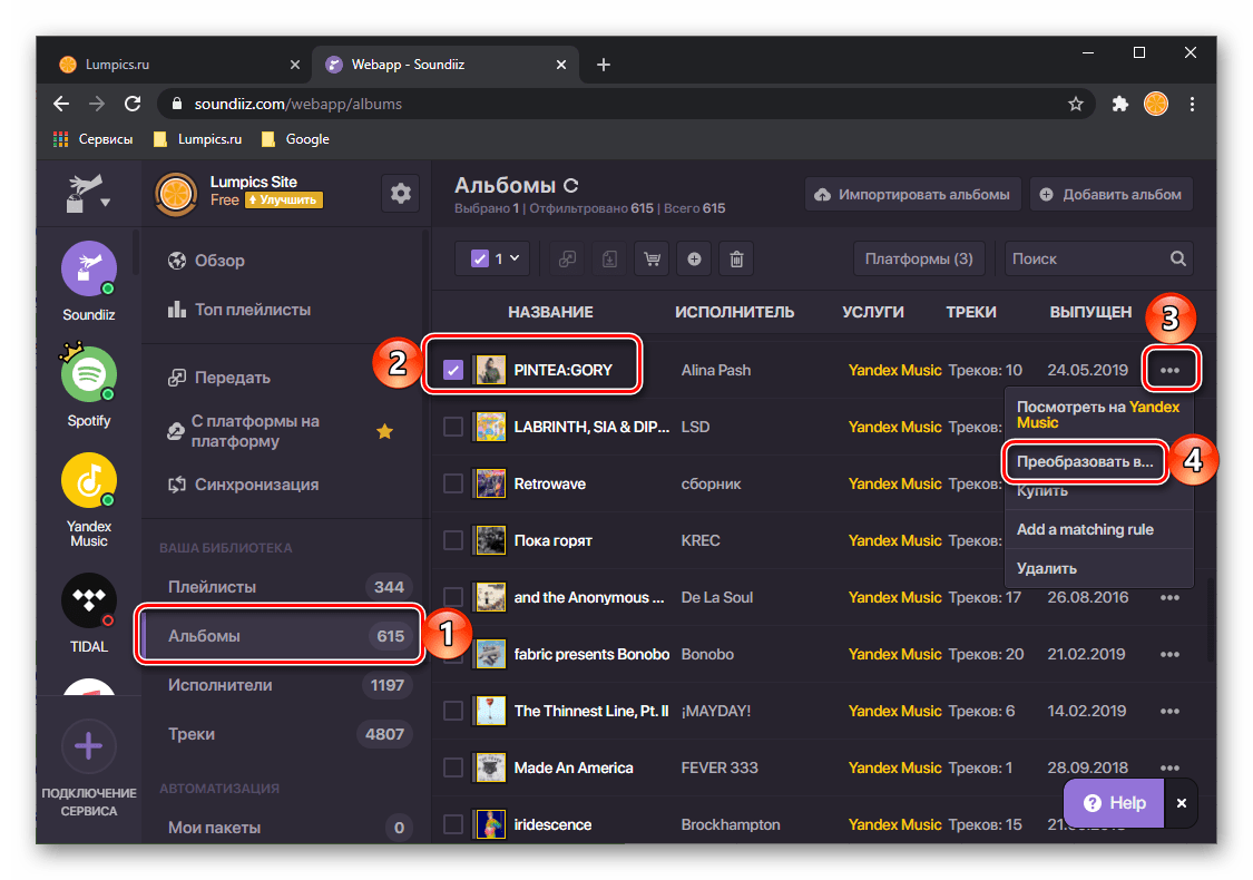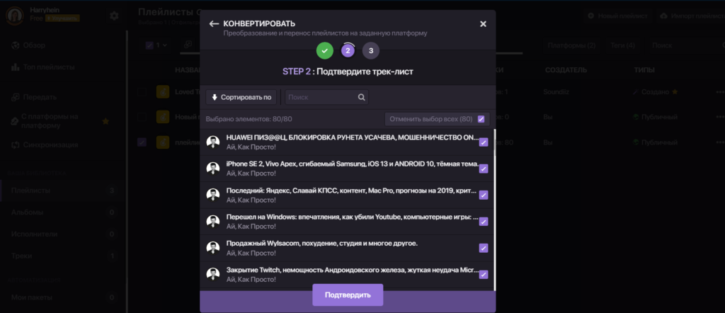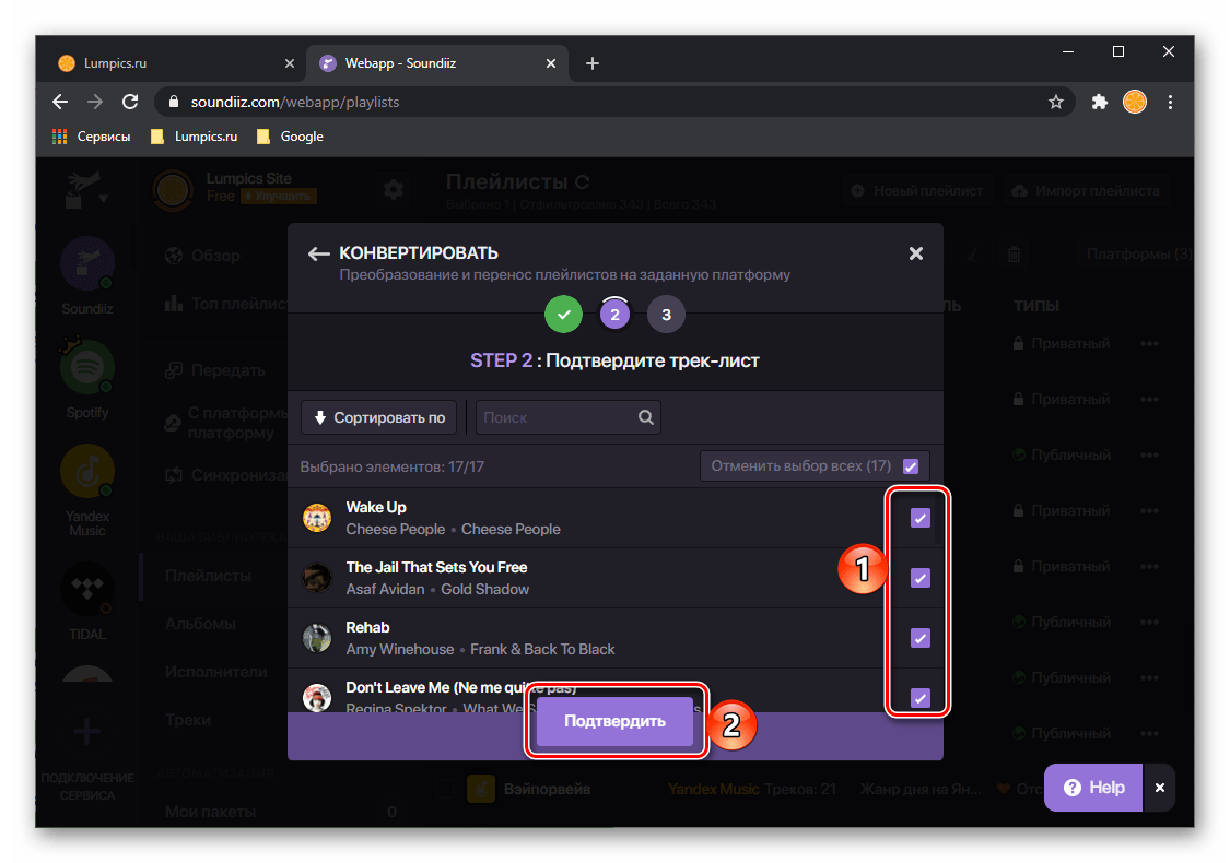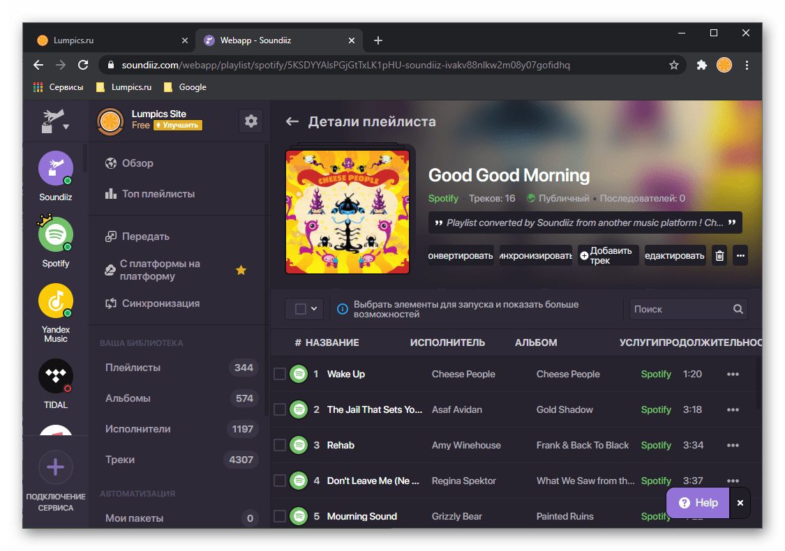 Soundiiz дружит с огромным количеством музыкальных платформ, между которыми можно перекидывать плейлисты. Принцип точно такой же, как и в Tune My Music.
