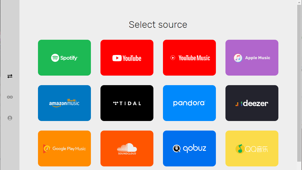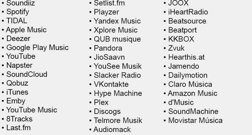 ︎ Apple Music ︎ Google Music ︎ YouTube Music ︎ Deezer ︎ Tidal ︎ Amazon Music ︎ Moodagent ︎ Qobuz ︎ SoundCloud ︎ Napster ︎ Kkbox ︎ LastFM ︎ Soundmachine