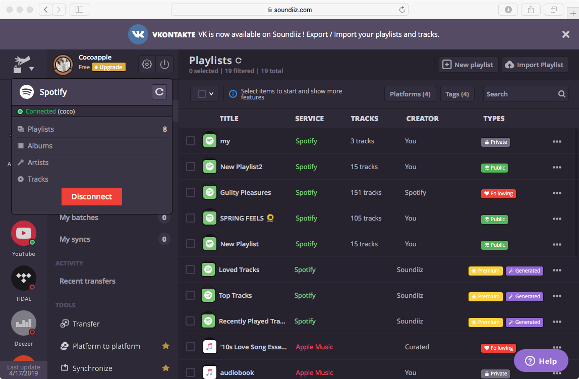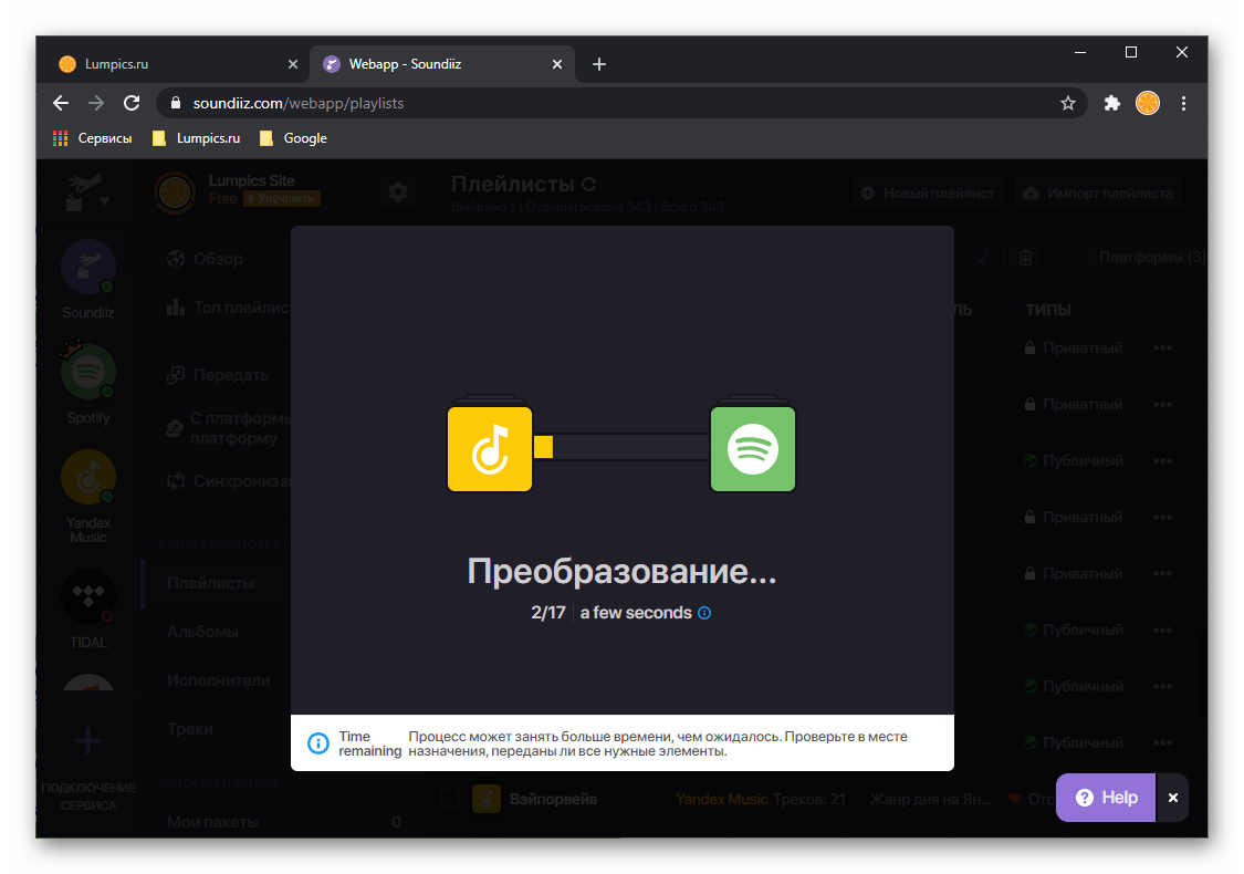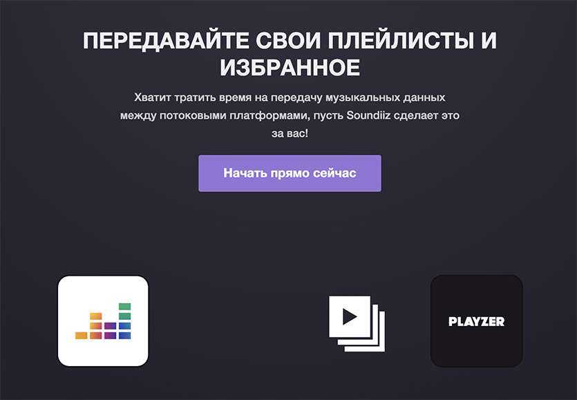 Сервис полностью бесплатный и позволяет экспортировать музыкальные библиотеки между Spotify, Apple Music, YouTube Music, Deezer, Tidal, Google Play Музыка, Soundcloud, iTunes и другими сервисами. Но поддержки «Музыки ВКонтакте» и «Яндекс.Музыки» тут нет.