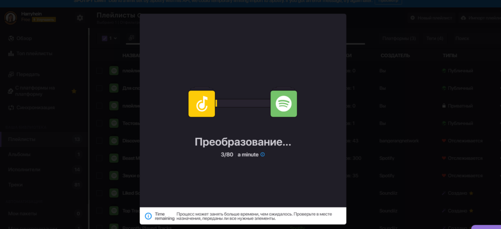 Через несколько минут импорт плейлиста в Spotify будет завершен! В работе алгоритма могут наблюдаться определенные сбои, не все треки могут быть загружены, но это лишь небольшие минусы, в общем не влияющие на итоговый результат.
