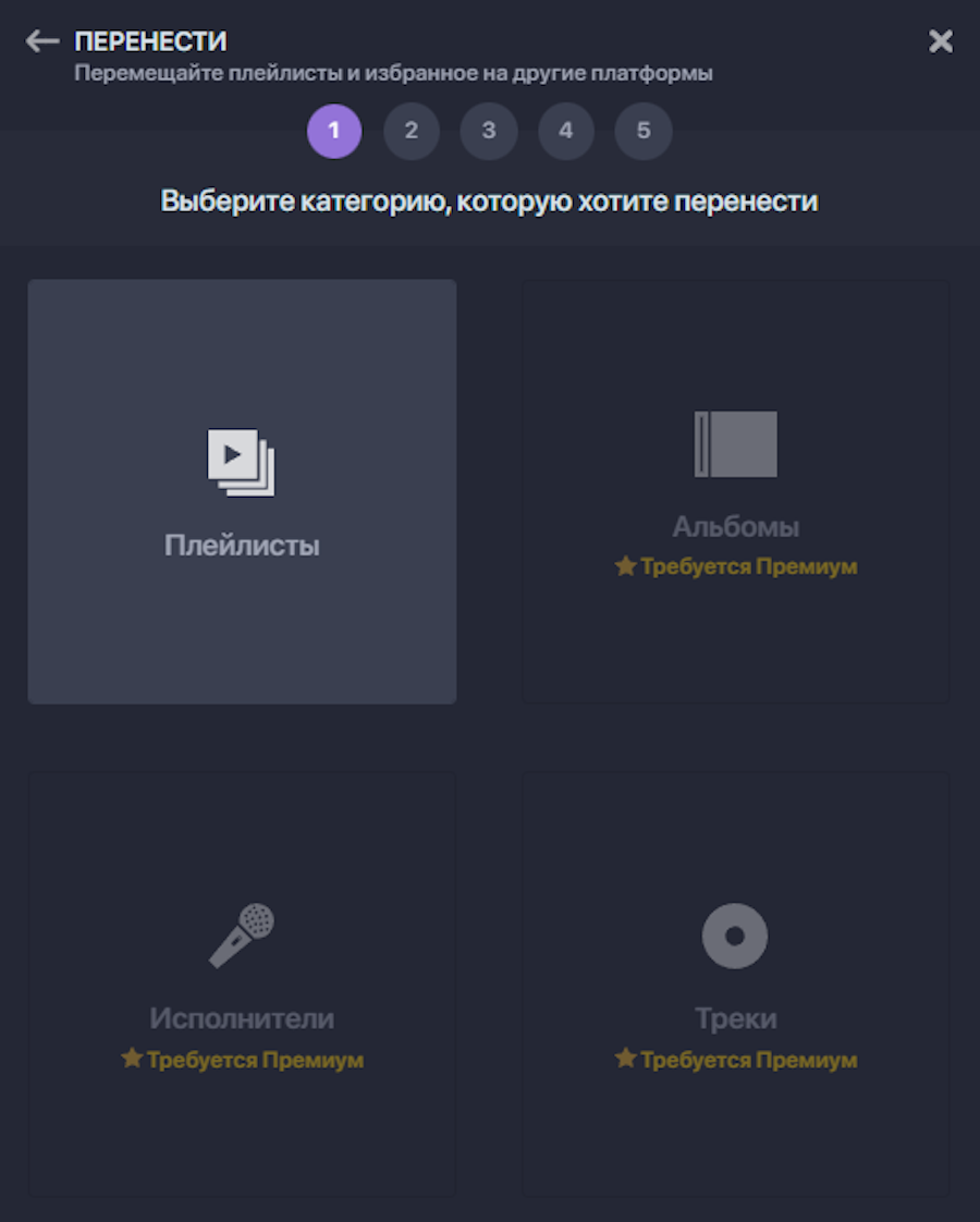 - Выбрать категории элементов, которые вы хотите перенести: плейлисты, треки, исполнителей, альбомы. Исполнителей и альбомы можно скопировать не на все площадки.
