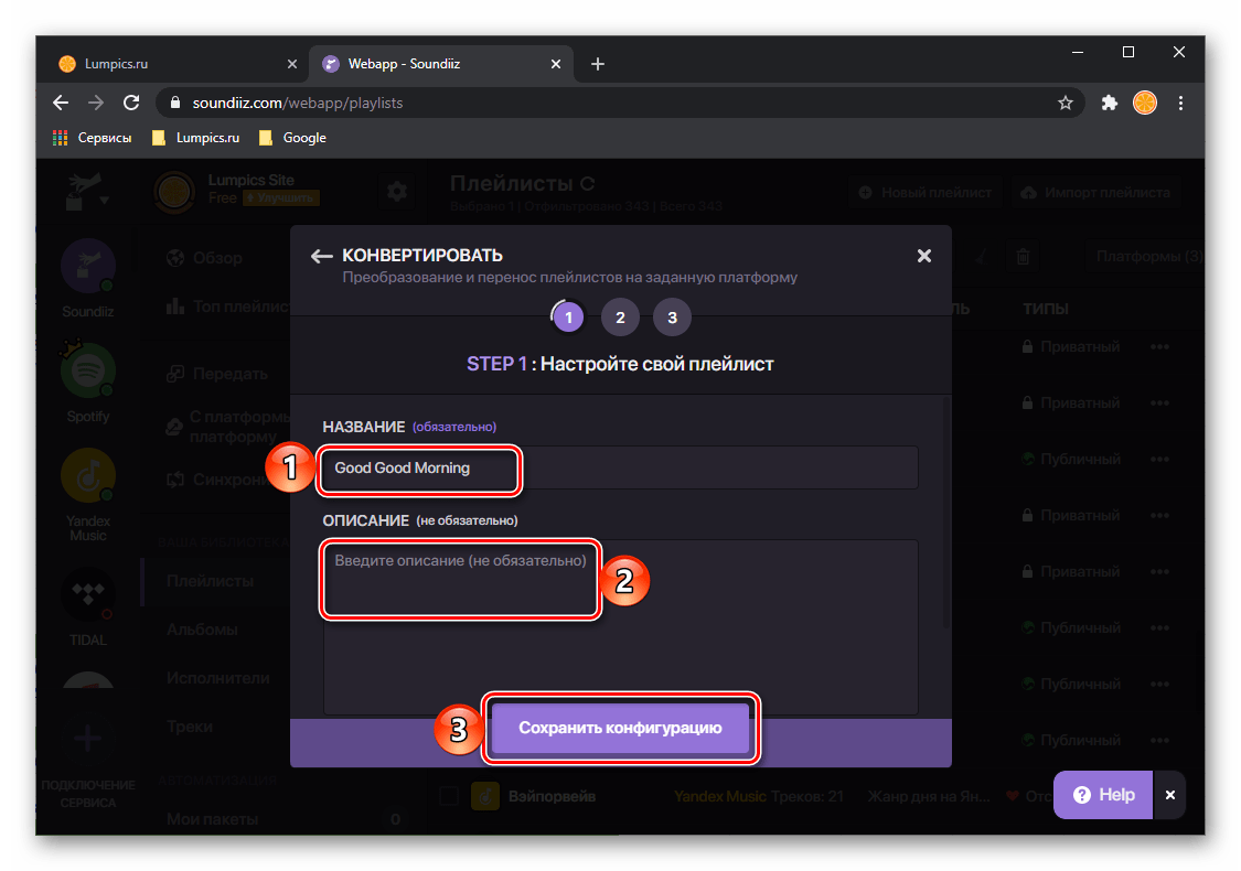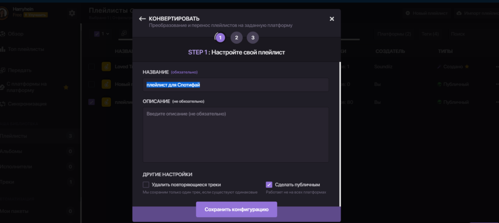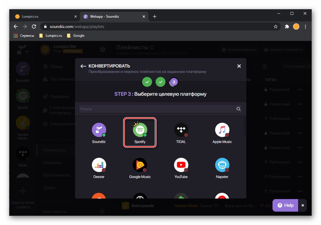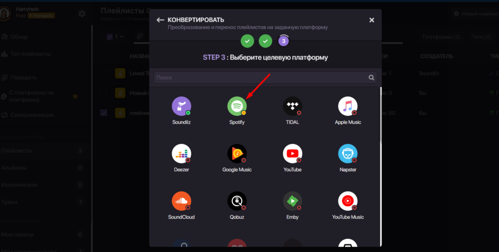 Нужно зарегистрироваться, выбрать музыкальный сервис из которого хотите вытянуть плейлист, затем выбрать нужный плейлист и указать конечную площадку, в нашем случае – Spotify.