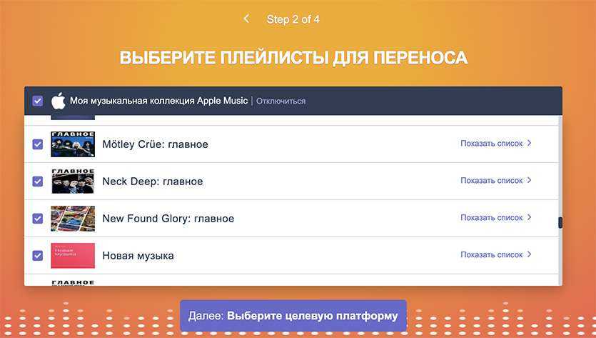 Этот мобильный сервис работает по тому же принципу, что и web-аналоги: выбираете исходную и конечную музыкальную платформу, отмечаете, какие плейлисты нужно перенести и ждёте.