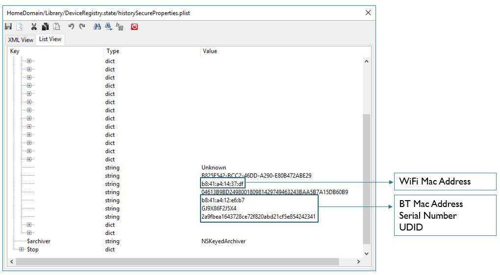 В файле хранится серийный номер часов, уникальный идентификатор UDID (UniqueDeviceIdentifier), MAC-адреса адаптеров Wi-Fi и Bluetooth подключенных к телефону часов Apple Watch.