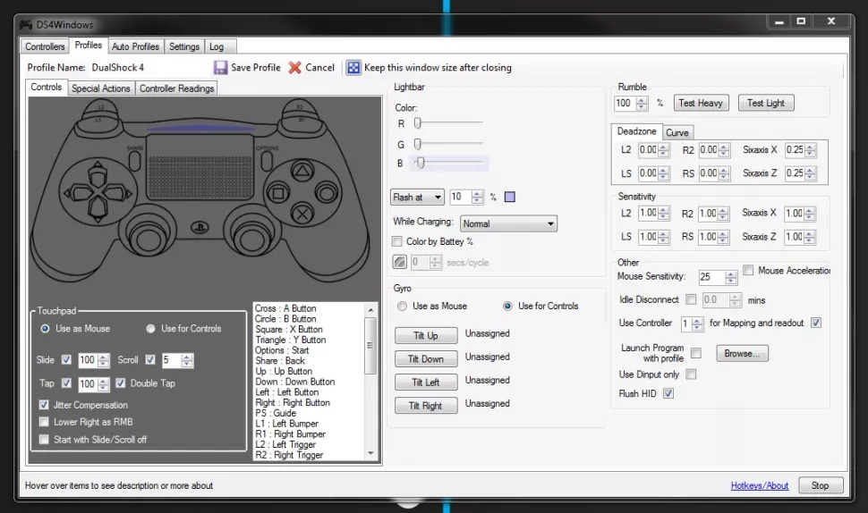 Скачайте, установите и откройте приложение. После открытия мы сразу поймем, что каждая игра, в которую мы хотим играть с джойстиком PS4, должна иметь специальное сопоставление. Вы можете сразу приступить к созданию нового профиля, нажав Command + N на клавиатуре, мы советуем переименовать профили на основе заголовков, с которыми вы собираетесь их использовать. Сохранение профилей происходит автоматически.
