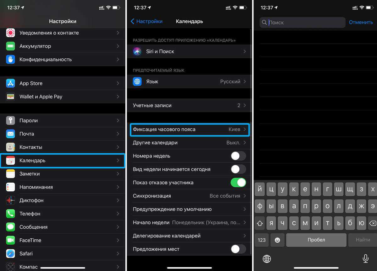Настройки переопределения часового пояса — Настройки календаря на iPhone