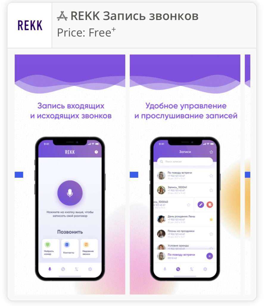Rekk предлагает удобный и понятный интерфейс для записи входящих и исходящих звонков и прослушивания разговоров. У программы богатый функционал. Каждая запись автоматически конвертируется из разговора в текст. В приложении есть возможность оставлять заметки к записанным разговорам. Также есть встроенная функция определителя номера и блокировка звонков от нежелательных номеров. В приложении можно самим редактировать записи, например, вырезать ненужные участки записанных разговоров. Стоимость программы составляет 349 рублей за неделю, 499 рублей за месяц и 999 рублей за год.