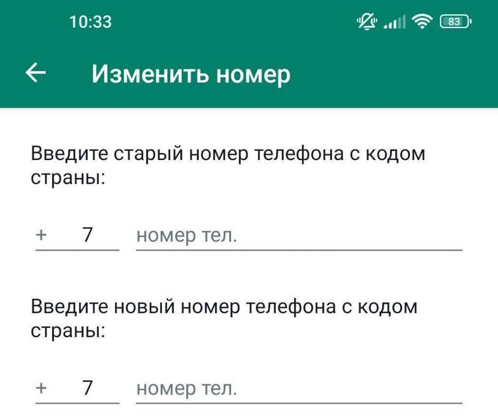 Рис. 4. Окно для ввода старого и нового номера с целью изменения номера телефона (со старого на новый) в приложении WhatsApp.