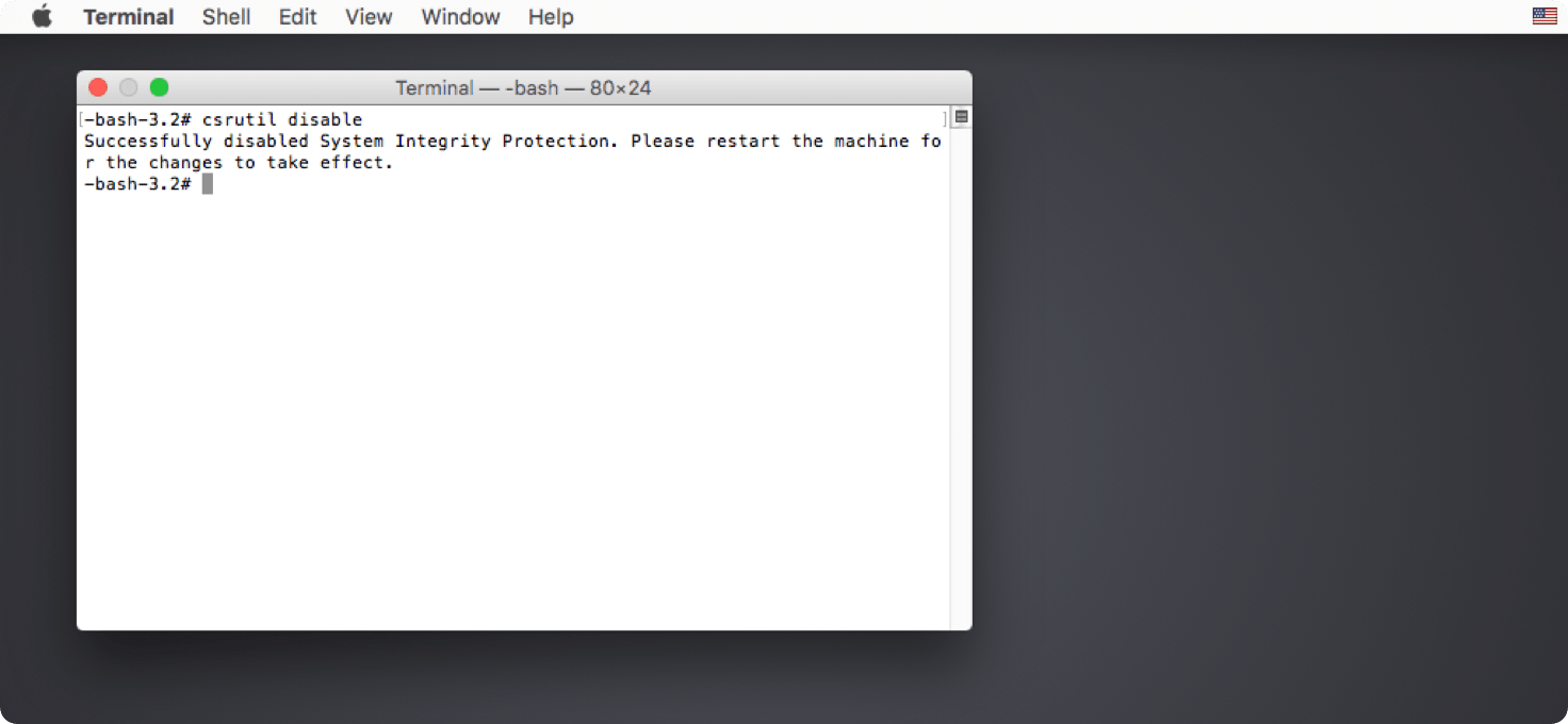 Во всплывающем окне выберите « Дисковая утилита «>» Утилиты «>» Терминал «> Введите командную строку,» csrutil отключить » а также Enter .