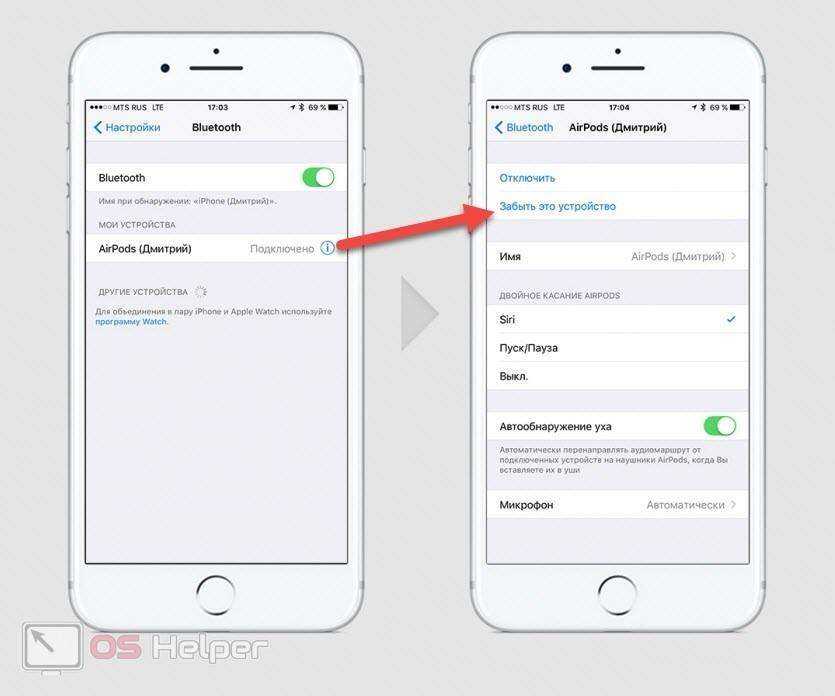 - Если ранее Аирподсы были подключены к Айфону или другому устройству, выполните сброс соединения. Меню «Настройки» → Bluetooth → Наименование сопряжённого устройства→ режим «Забыть это устройство».