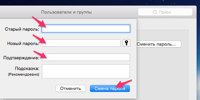 Когда вы нажмете на кнопку «Сменить пароль…», на вашем macbook или компьютере откроется окошко, в котором вам нужно будет выполнить следующие действие: И так в поле «Старый пароль:» указываем пароль, который вы указывали при входе в свою учетную запись. После того как вы укажите свой пароль, вам останется нажать на кнопку «Смена пароля».