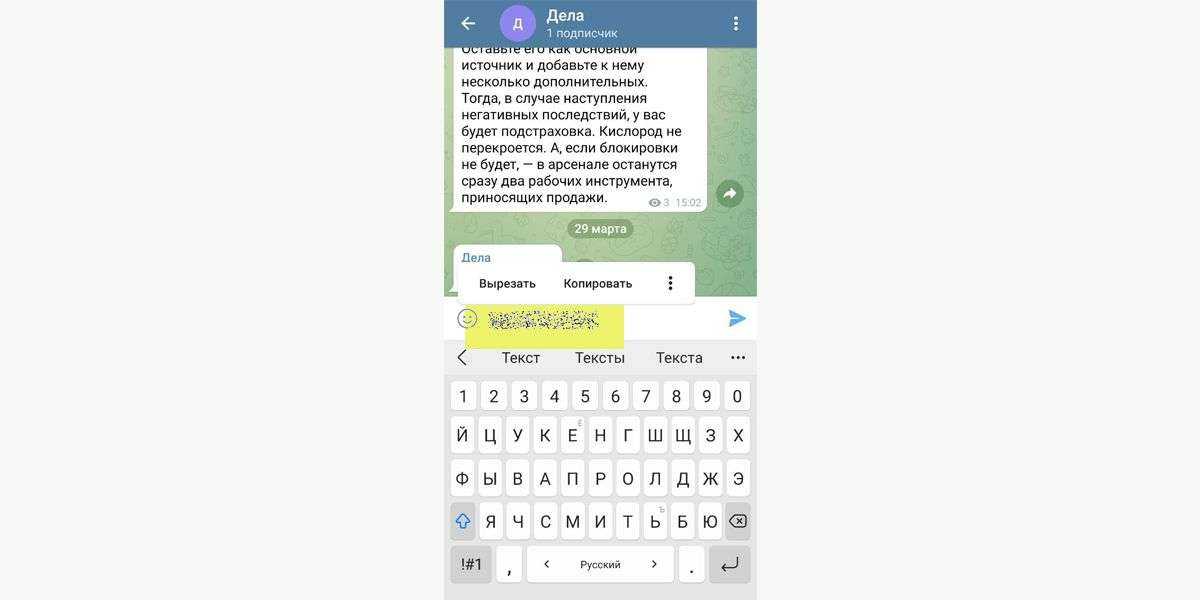 Откройте чат, куда хотите написать, введите текст. Теперь выделите слова, которые хотите скрыть. Выделять следует долгим нажатием на любое из слов и растягиванием на нужные слова.