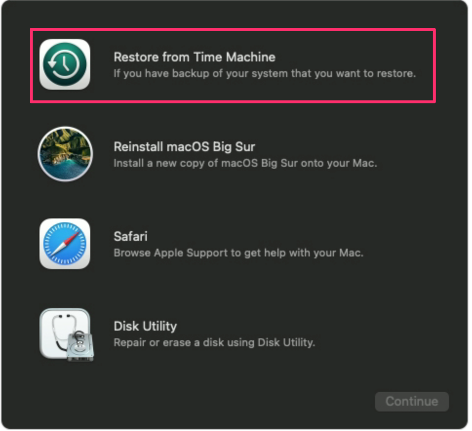 - Choose Restore from Time Machine. Then click Continue.
