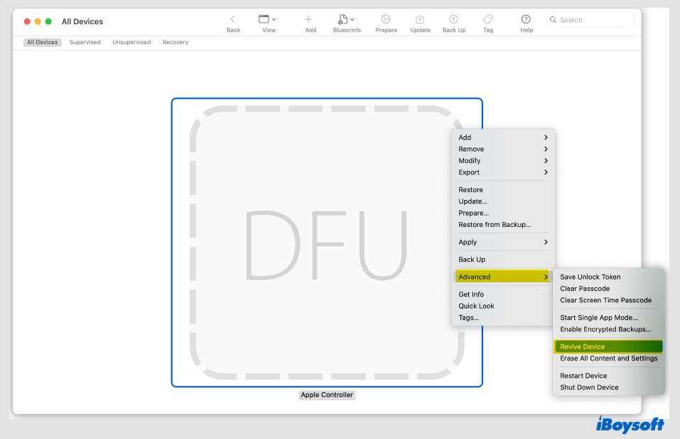 - 5. Right-click on your Mac device, and choose Advanced > Revive Device, then click Revive.