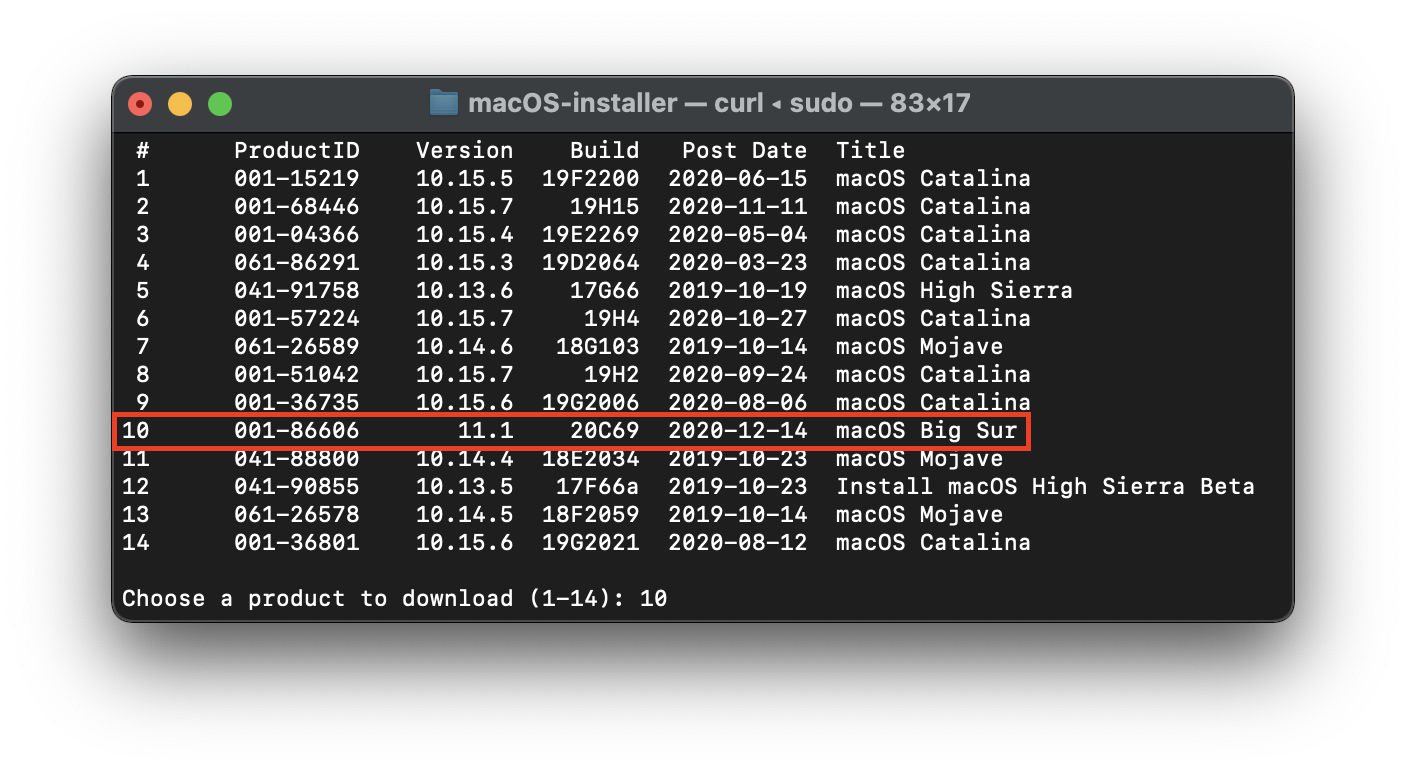 Как вы видите, мы получаем большой список установщиков macOS. Если вам нужна определенная версия macOS, вы можете выбрать её, набрав её номер. Для этого примера, мы выберим 10: