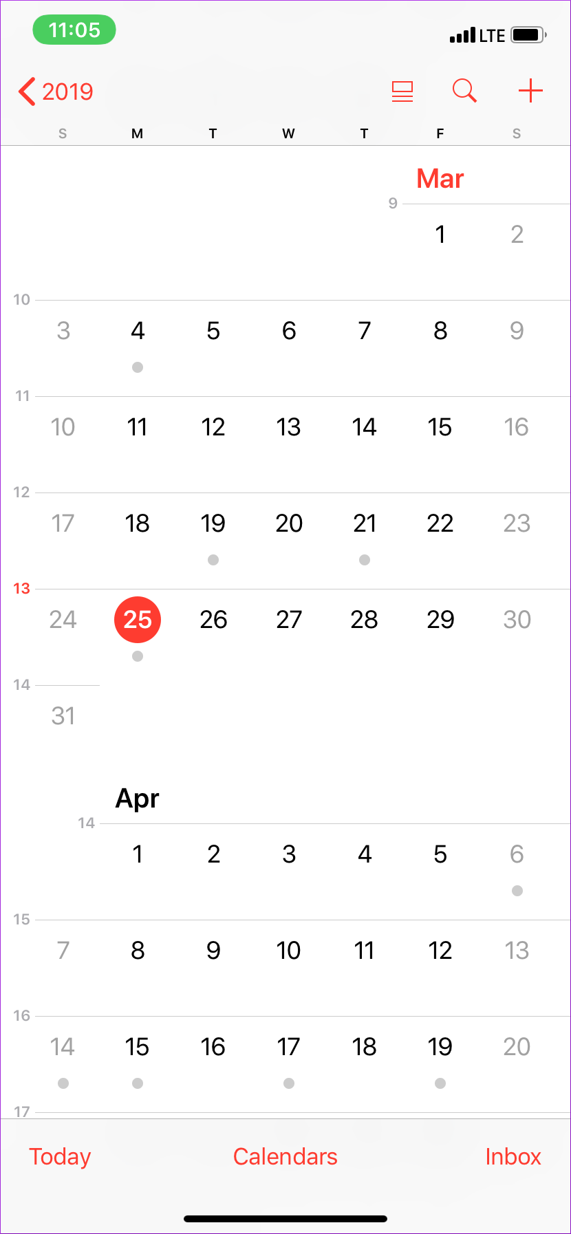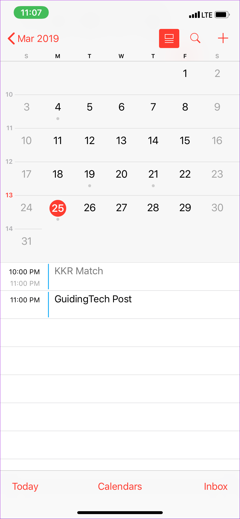 Календарь Apple использует белую тему с красными шрифтами и акцентом. Первая нижняя вкладка — Сегодня, которая отображает все события в категории дня. Вкладка «Календарь» позволяет выбирать из разных календарей iCloud и устройств. С помощью папки «Входящие» вы можете подтвердить и отклонить приглашения на собрания.