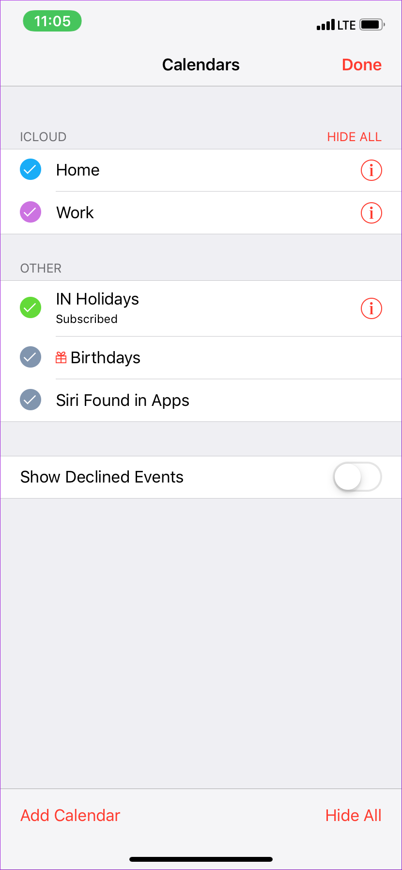 Нажмите красный кружок i рядом с именем календаря, чтобы изменить цвет по умолчанию, связанный с календарем, или даже измените его имя, затем нажмите Готово в верхней части экрана.