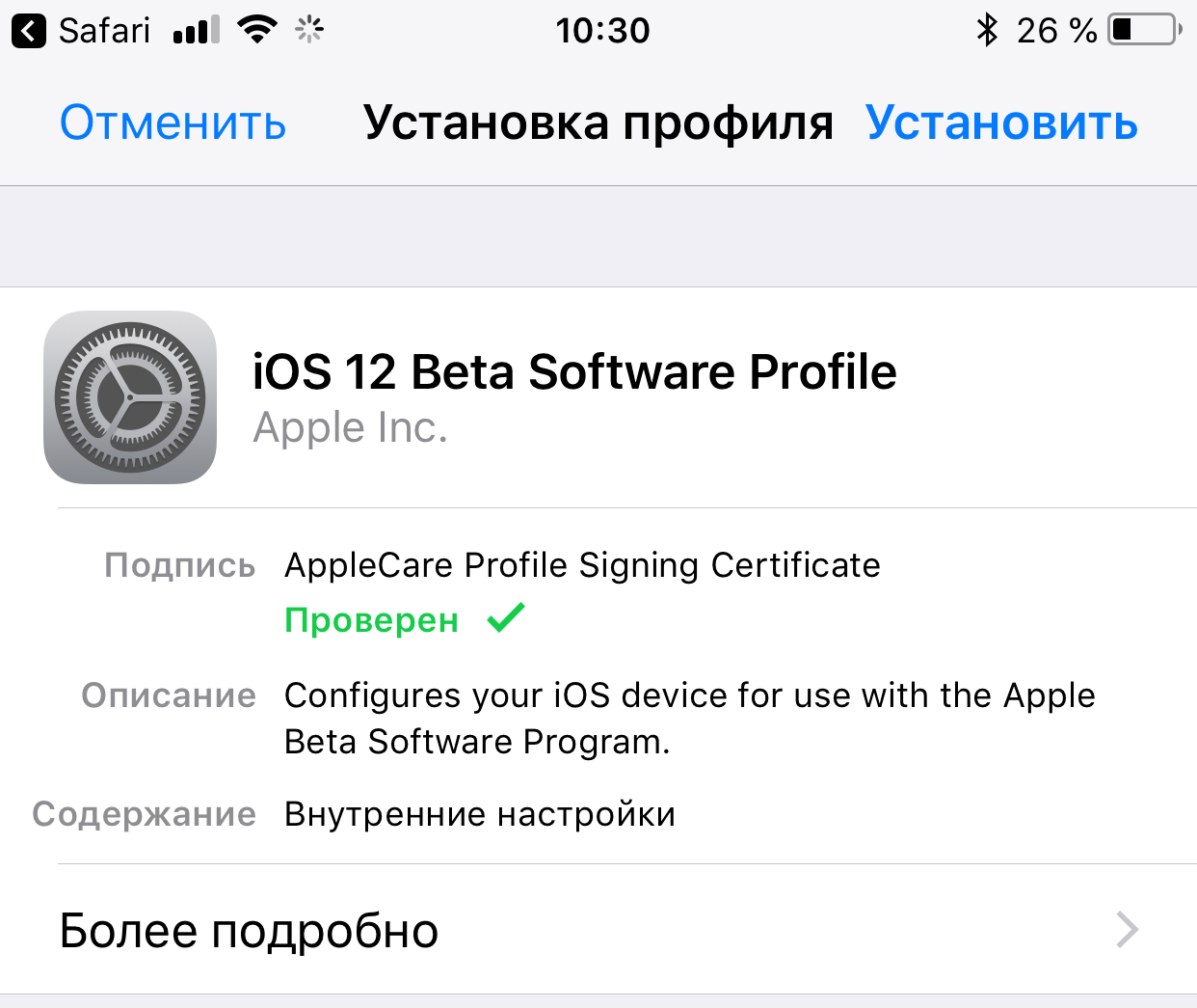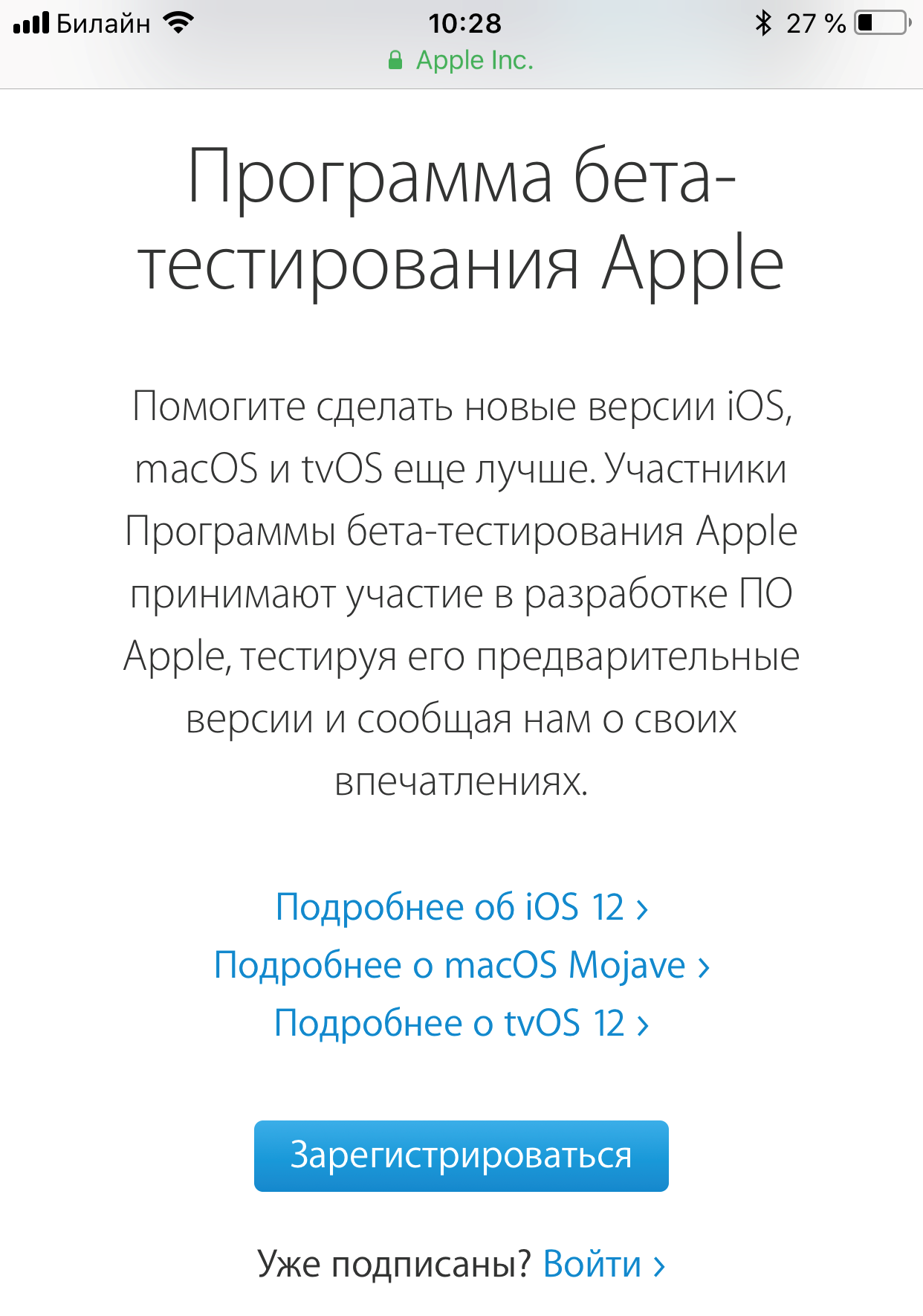 В отличие от стабильных релизов iOS, скачать которые можно с помощью одного лишь нажатия, и бета-версий для разработчиков, загружаемых привычным образом, для получения публичной iOS 12 beta устройство нужно зарегистрировать. Для этого необходимо: