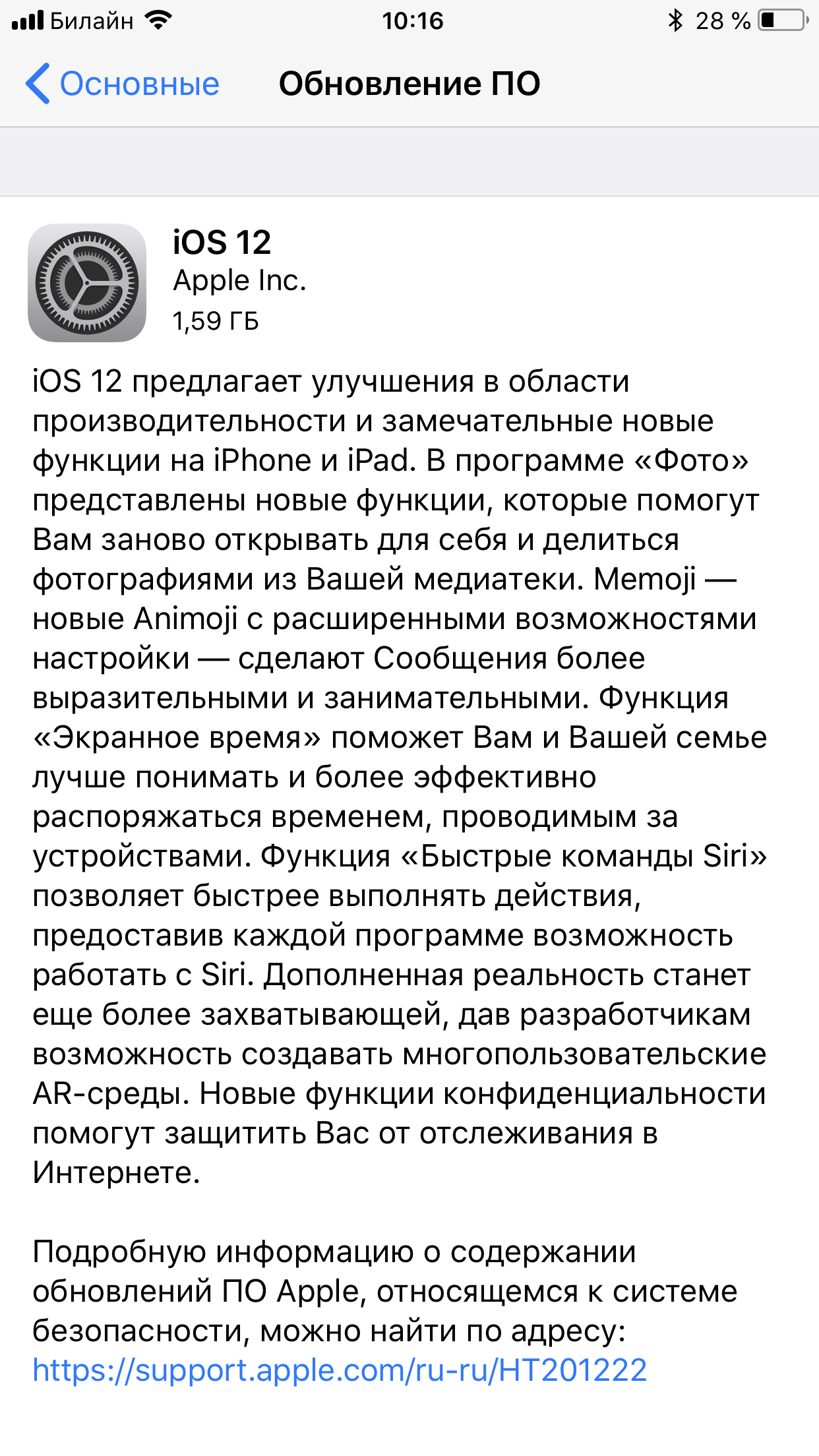 Прокрутите список обновлений до самого низа и жмите на кнопку «Загрузить». Для полной установки iOS 12 потребуется не менее 50 % заряда или подключение к источнику питания: