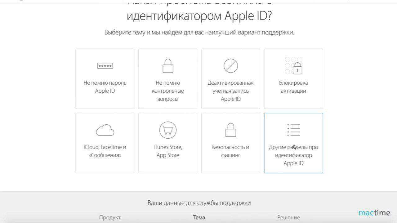 - Кликните на «Получение помощи» → «Apple ID» → «Тема отсутствует в списке».
