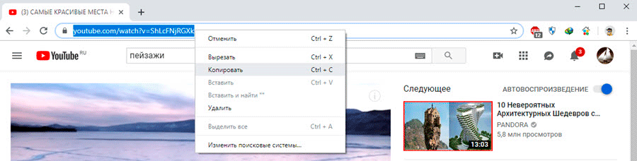 Для загрузки видео откройте любой ролик на Ютубе через браузер. И скопируйте ссылку: правой кнопкой мыши по адресной строке – Копировать.
