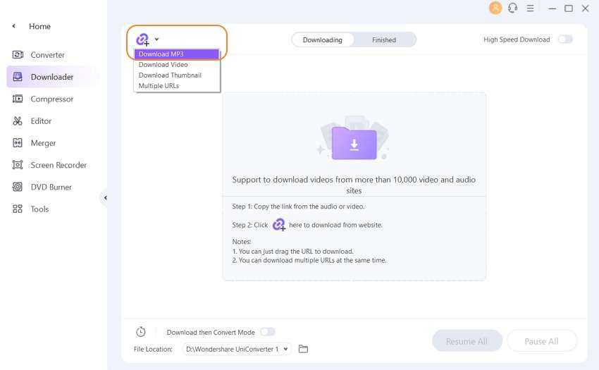 Откройте Wondershare UniConverter на вашем ПК / Mac после загрузки и установки, выберите раздел Загрузки из основного интерфейса. Откройте выпадающее меню на кнопке +Paste URL и выберите опцию Загрузчик.