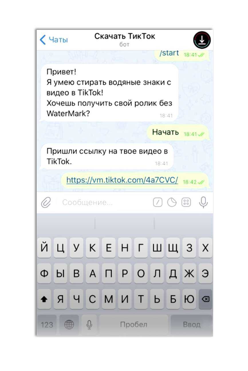 Чтобы найти бота, введите в строке поиска Телеграм его название или запрос «скачать видео из Тик Ток». Телеграм предложит список ботов. Принцип работы у всех одинаковый: отправляем боту ссылку на ролик, который приходит в ответ без водяных знаков. Загрузить приватный материал, который отмечен замочком, невозможно. Часть ботов показывают рекламу или не дает скачать файл без подписки на телеграм-канал.
