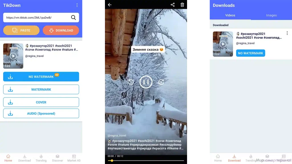 TikDown позволяет удалить водяные знаки на любом видео. Также с ним получится скачать превью к роликам в виде изображений. А понравившиеся именно звуковой дорожкой записи можно сохранить в формате аудио для дальнейшего прослушивания без открытия видеоролика. Встроенных инструментов достаточно для максимально удобного скачивания контента на смартфон или планшет.