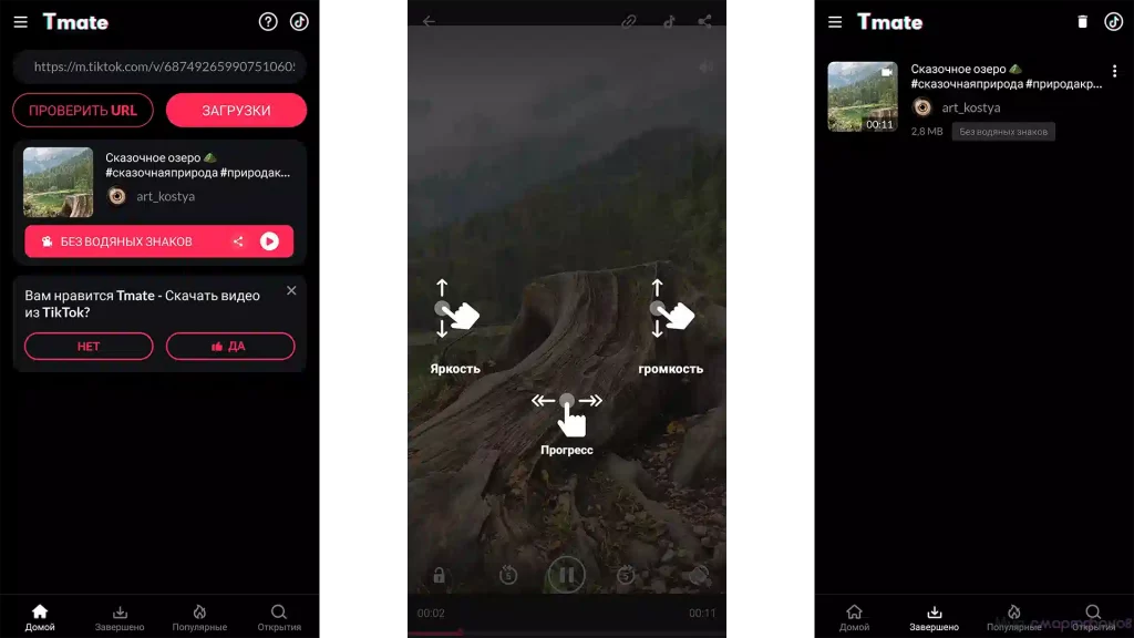 Скачать клип из Тик Ток без водяного знака в приложении можно буквально за пару секунд. Достаточно скопировать ссылку на ролик и открыть Tmate. После этого загрузка запустится автоматически. А еще проще будет найти понравившееся видео, нажать кнопку «Поделиться» и выбрать в списке приложение для загрузки. Контент из Тик Ток сразу начнет скачиваться на смартфон. В обоих случаях видео сохранится без водяных знаков. Также ознакомиться с популярными роликами или каналами получится прямо из Tmate. Там же можно выбрать либо найти по ключевым словам любой контент для сохранения.