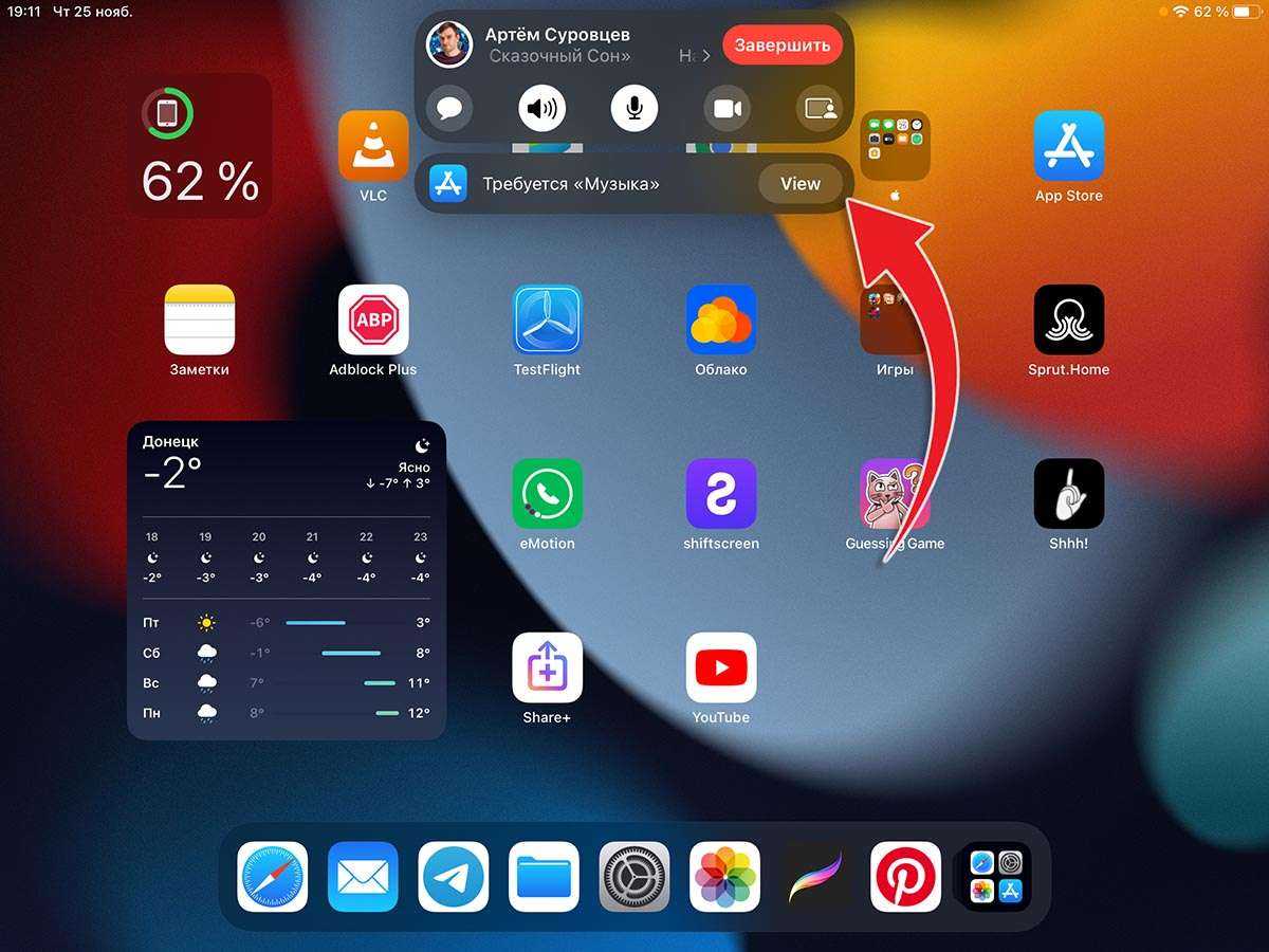 ● Во время вызова FaceTime следует запустить нужное приложение и выбрать возможность делиться экраном через баннер управления вызовом.