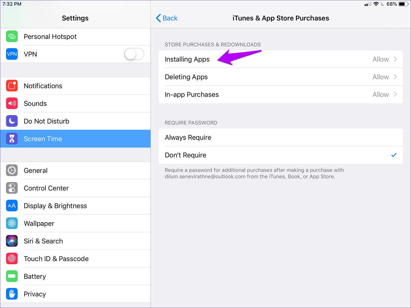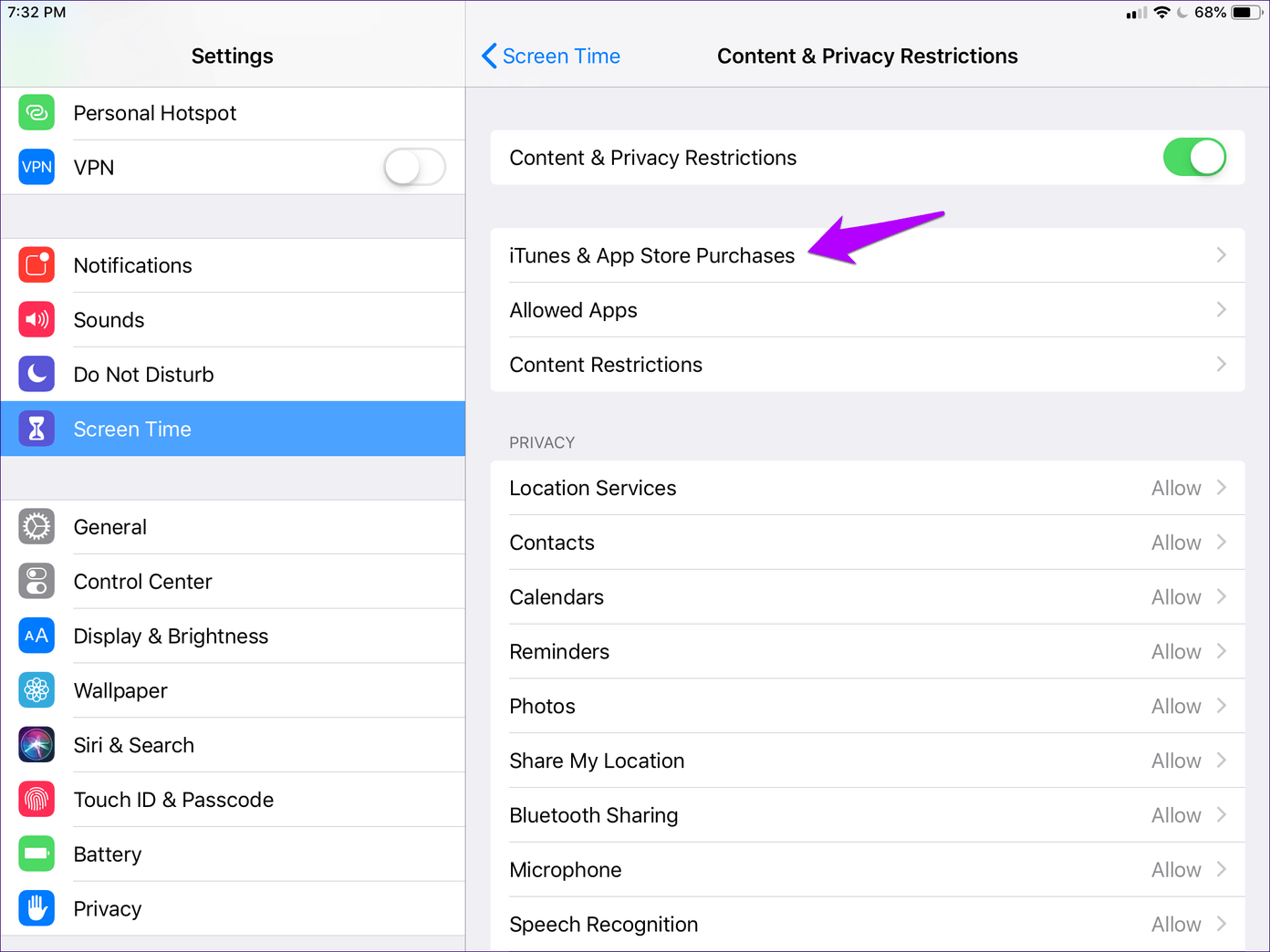 Шаг 2. На панели «Время экрана» нажмите «Контент и ограничения конфиденциальности», а затем нажмите «Покупки из iTunes и App Store».