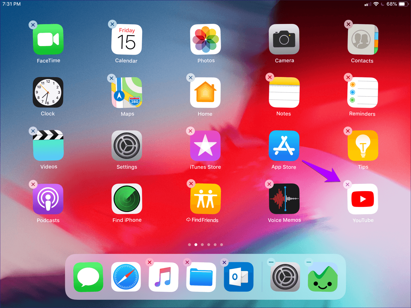 Шаг 1: Удалить YouTube. Чтобы сделать это, нажмите и удерживайте значок YouTube, подождите, пока он покачивается, а затем нажмите на крошечный ‘x’ ‘в верхнем левом углу значка приложения YouTube.