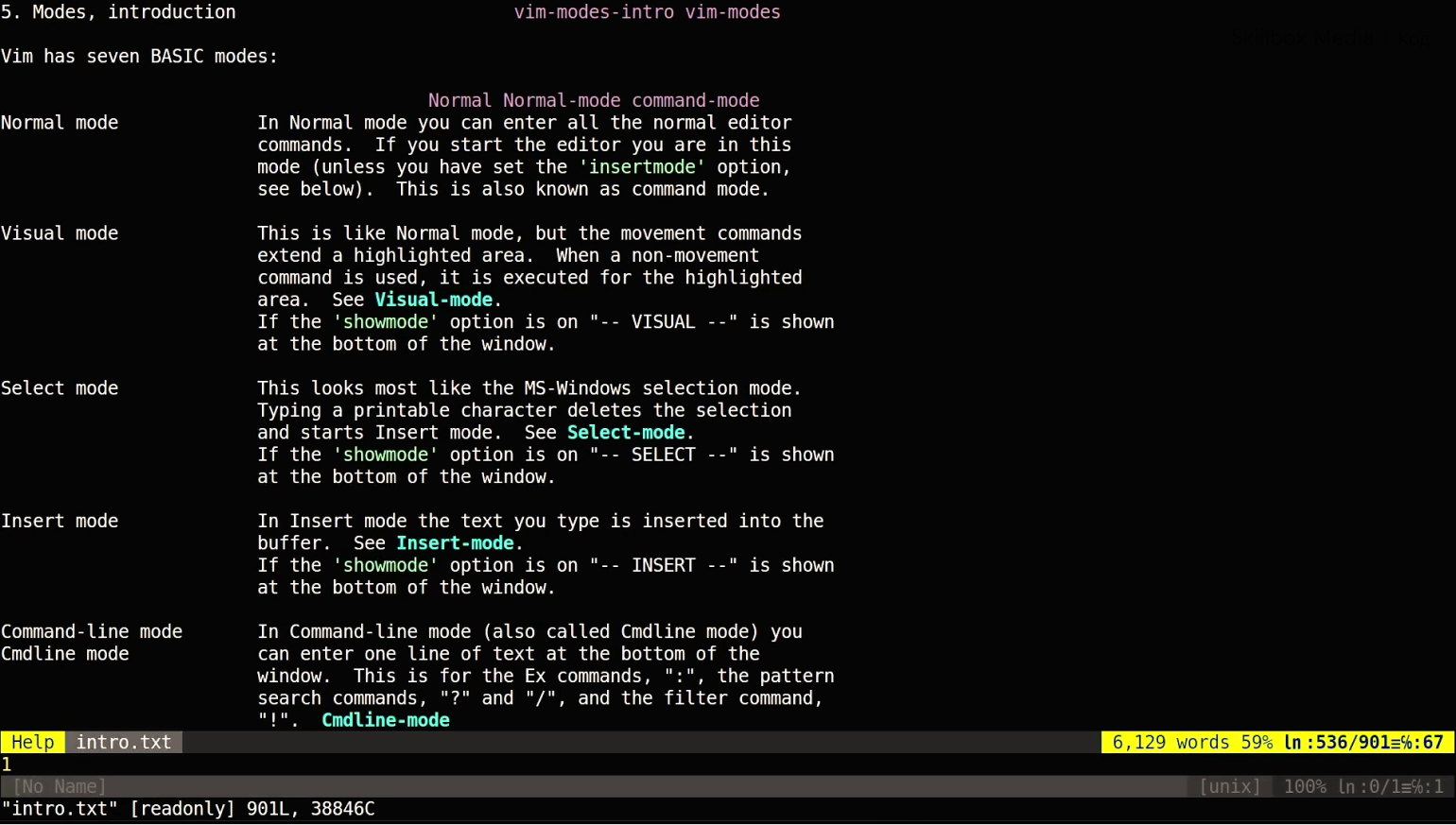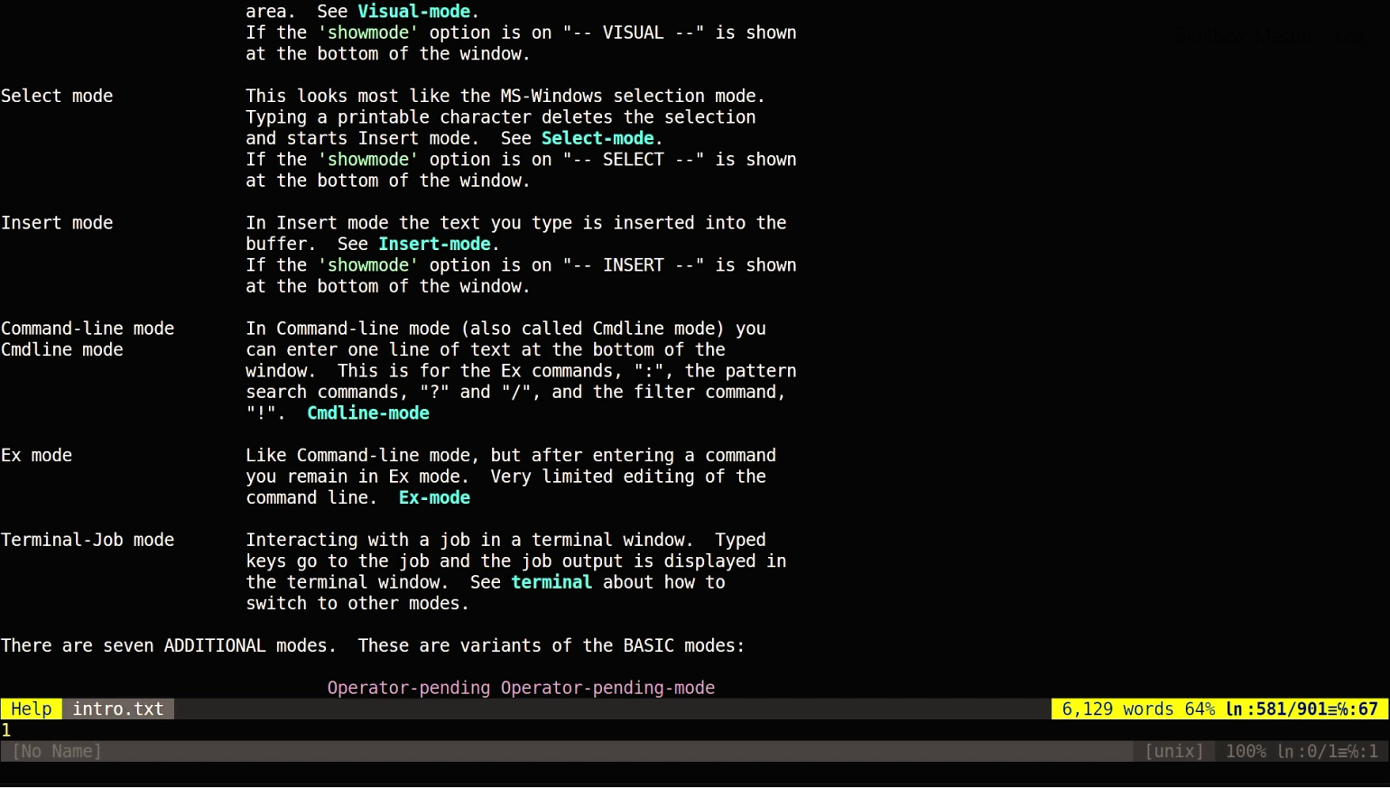 Чтобы узнать список режимов, которые доступны в версии Vim, установленной у вас на машине, открываем Vim и вводим команду :help vim-modes. Давайте попробуем.