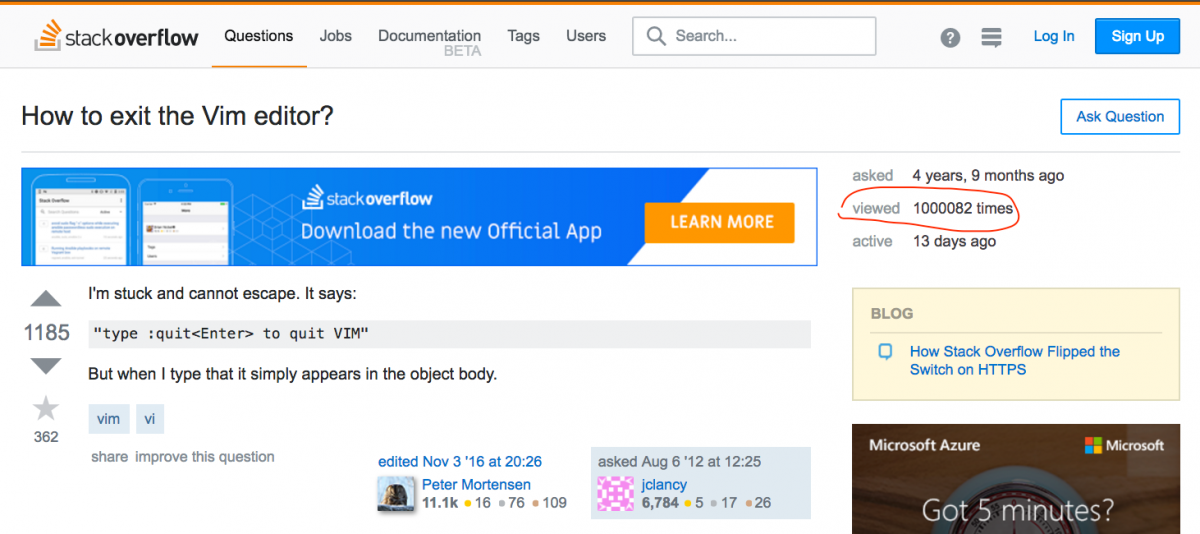 23 мая 2017 года вопрос «Как выйти из Vim?» набрал один миллион просмотров на Stack Overflow