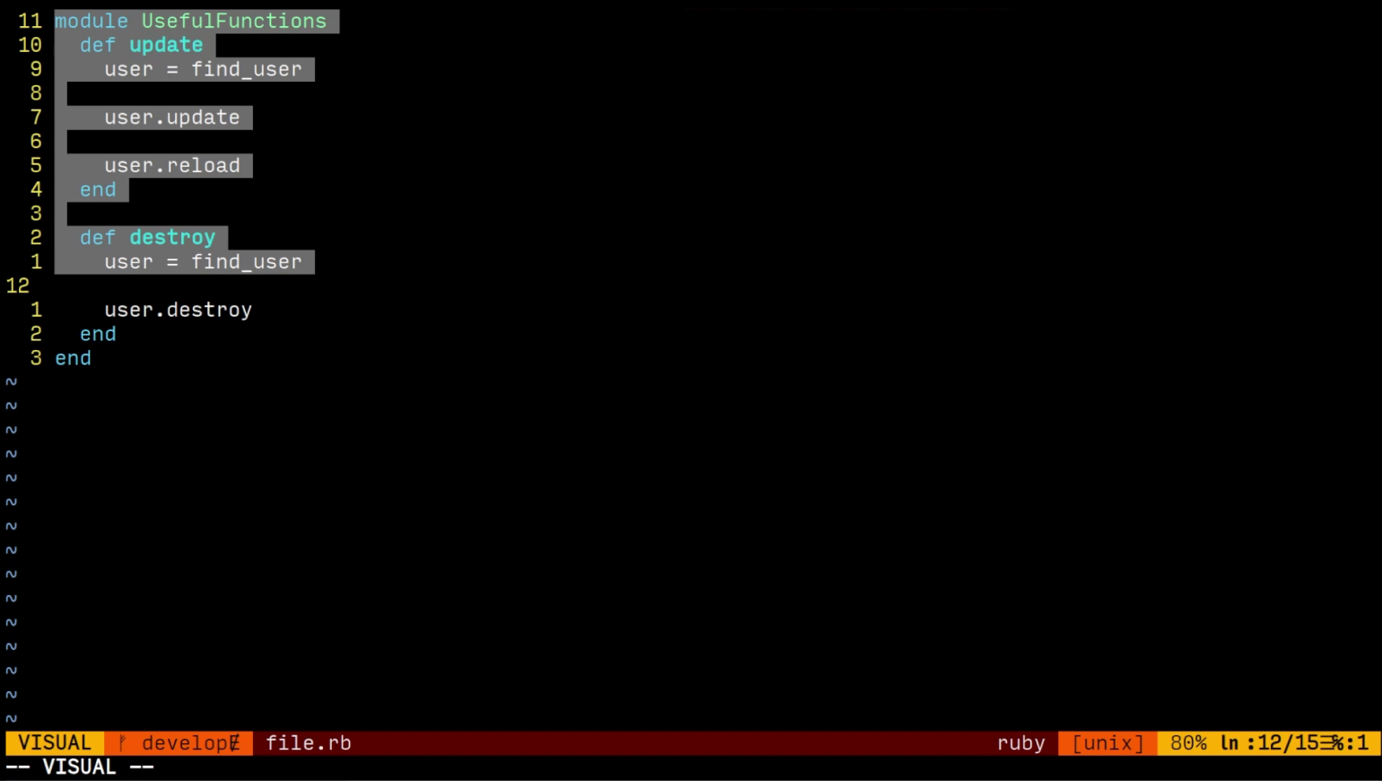 Чтобы удалить текст, мы используем клавишу X. Для выделения текста нужно перейти в визуальный режим при помощи клавиши V.