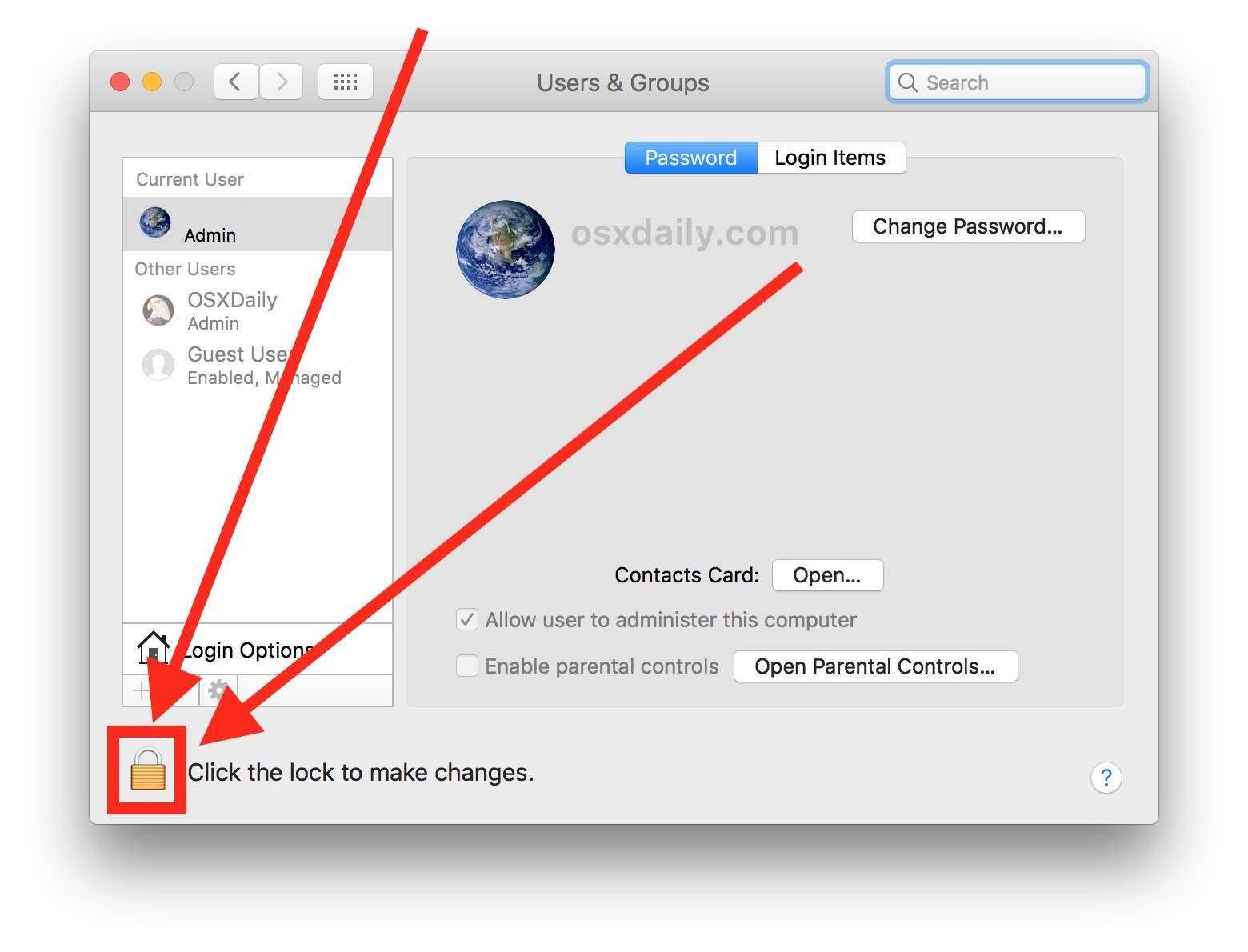 Нажмите на значок замка в углу, затем введите существующую учетную запись администратора и пароль, чтобы разблокировать панель настроек.