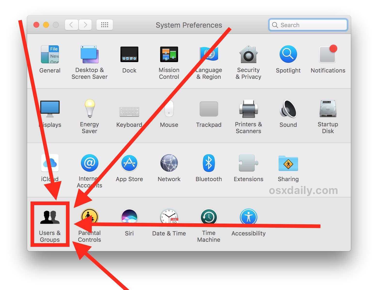 Откройте программу «Системные настройки» и выберите раздел Пользователи и группы