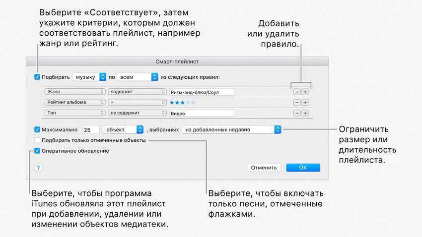 Смарт-плейлисты — это фильтры песен. Они автоматом собирают все, которые подходят под перечень правил.