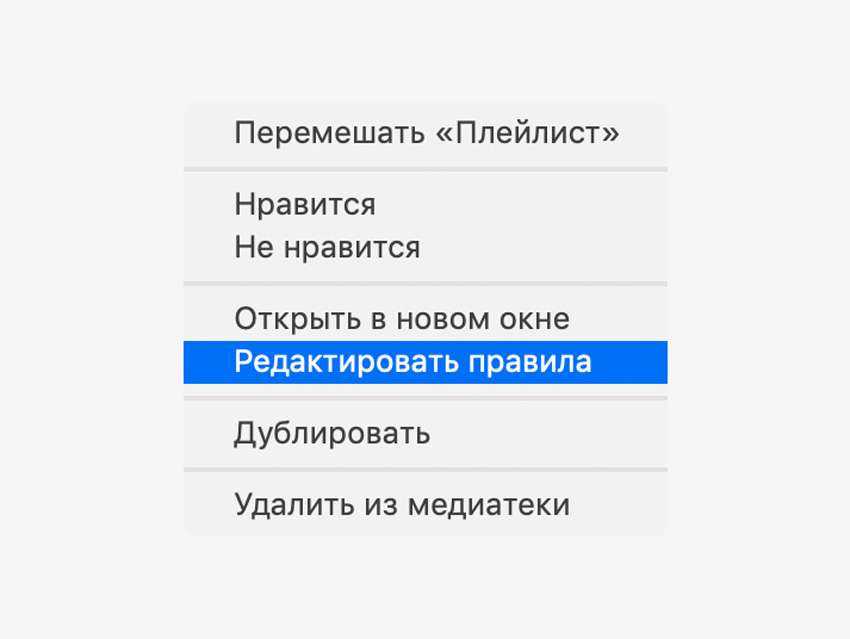 Найдите умный плейлист сбоку и активируйте контекстное меню. Здесь нужно выбрать пункт «Редактировать правила».