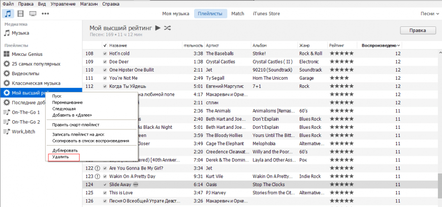 Если вы хотите стереть весь плейлист, выделите его и нажмите клавишу Delete или щелкните правой кнопкой и воспользуйтесь пунктом «Удалить». Удалить из iTunes можно как обычный плейлист, так и смарт-подборку. Чтобы удалить подборку на iPhone или iPad, подключите устройство к компьютеру и выполните синхронизацию.