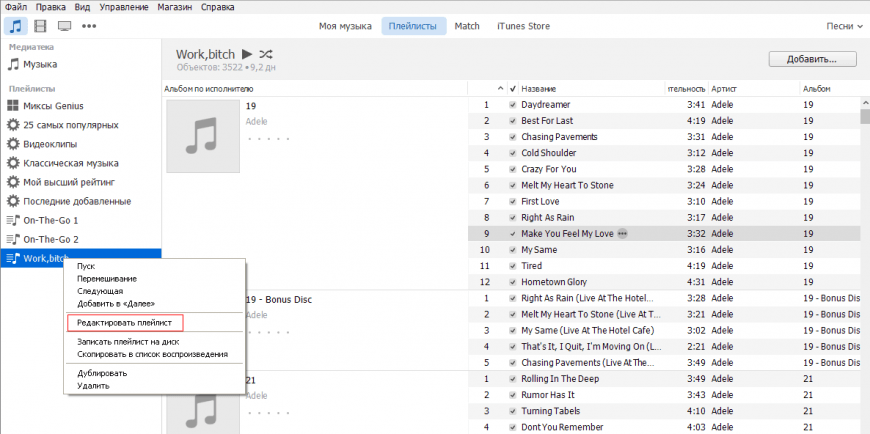 Каждый созданный плейлист добавляется в медиатеку и отображается в меню слева в окне iTunes. Если вы хотите изменить его состав, щелкните правой кнопкой и выберите «Редактировать». Вы можете изменить порядок воспроизведения треков, расположив их с помощью обычного перетягивания строк мышью. После синхронизации с iPhone/iPad порядок воспроизведения будет сохранен.