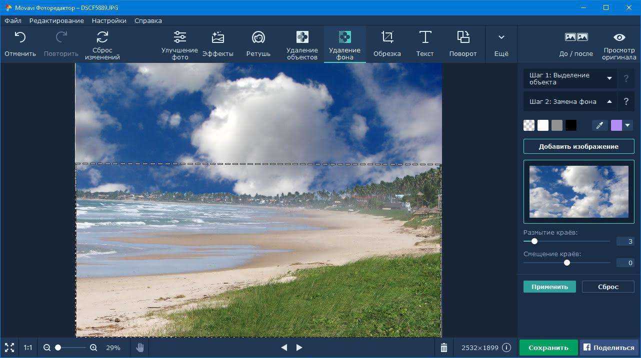 - Замена фона. С помощью этой функции можно кардинально изменить внешний вид фотографии. Для нового фона можно использовать собственное изображение, файл из библиотеки или же просто оставить фон прозрачным.