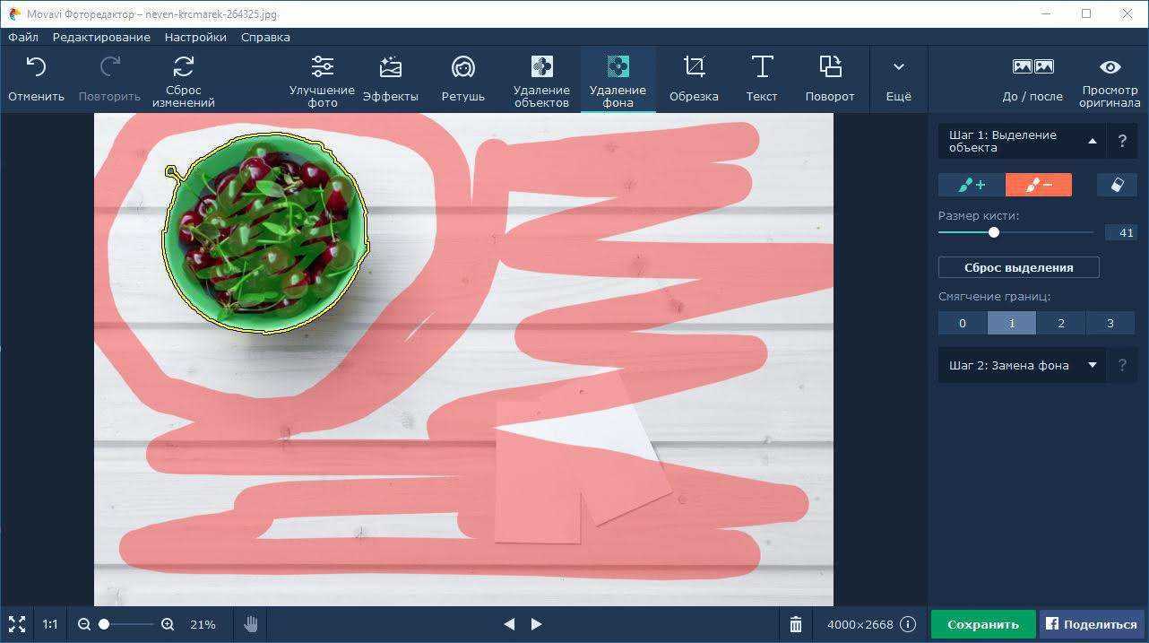 Также «Удаление фона» пригодится для отделения объекта от фона, чтобы использовать в коллаже. Сначала на Шаге 1 закрашиваете предмет, который вам нужен, кистью «+». Затем то, что не нужно, кистью «-«.
