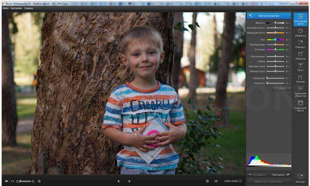 Фоторедактор Movavi обладает массой инструментов, позволяющих улучшать фотографии и устранять с них мелкие дефекты. Программой поддерживается цветокоррекция, управление экспозицией, настройка таких параметров как яркость, контрастность, четкость и детализация. С ее помощью вы можете избавиться от излишнего шума на фотографиях, сделанных в условиях недостаточного освещения, удалить с фото попавшие в кадр нежелательные объекты, без особых усилий заменить фон, добавить произвольный текст, применить художественные эффекты и фотофильтры.