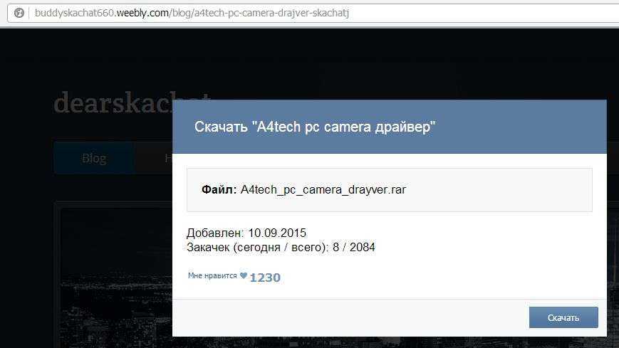 Решил провести рискованный эксперимент). Обновил базы антивируса и зашел на явно подозрительный сайт, чтобы показать вам, как это выглядит. Сходу нам предлагают скачать непонятно какой файл драйвера, даже без уточнения модели вебкамеры.