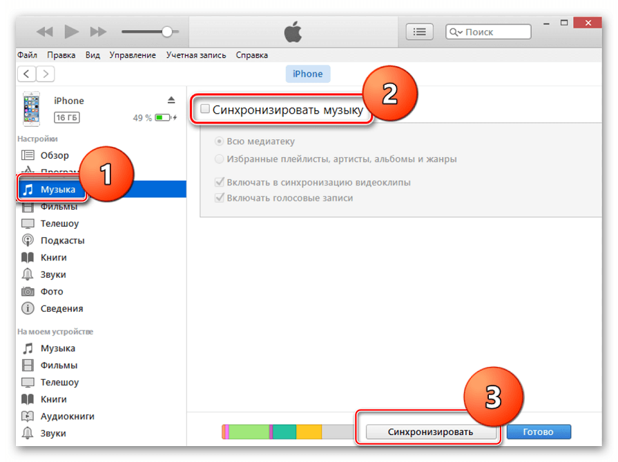Помните, что при синхронизации музыки содержимое телефона iPhone или планшета iPad всегда заменяется музыкальным содержимым программы iTunes. Поэтому если вы удалили песню из iTunes, то после синхронизации музыки она удалится и из памяти iPhone.