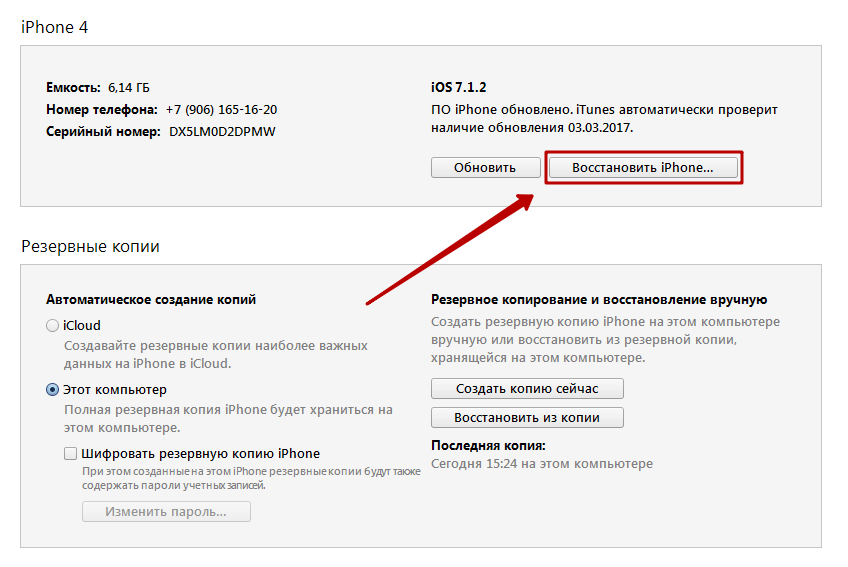 Этот способ удаления джейлбрейка является наиболее простым и безопасным: вам достаточно восстановить iPhone из резервной копии путём нажатия соответствующей кнопки в iTunes