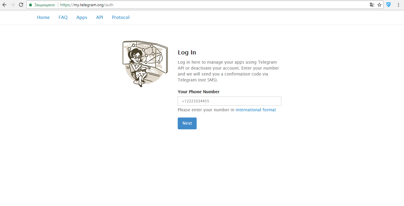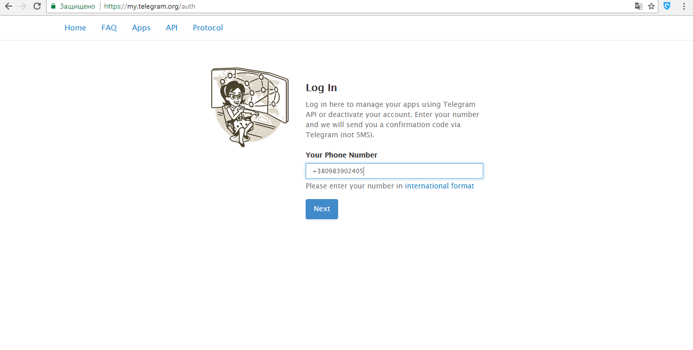 Далее вводится номер, к которому привязан аккаунт, и нажимаете кнопку «Next».