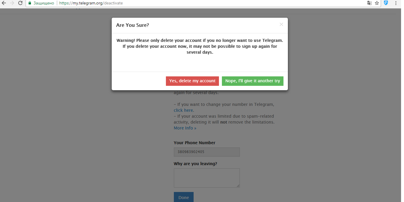 - Нажимаем на кнопку «Done», после чего Telegram еще раз спрашивает, уверен ли пользователь что он хочет удалить свою учетную запись. Для подтверждения жмем на «Yes, delete my account».